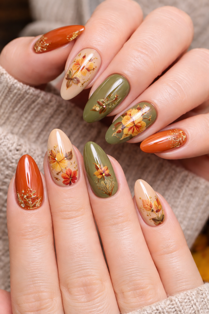 Autumn leaves symbolize the beauty of the season and work beautifully for Thanksgiving nail art. Shades of gold, rust, and olive green add depth and warmth.